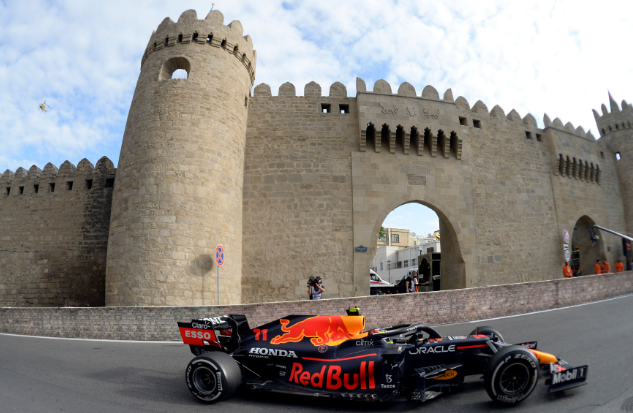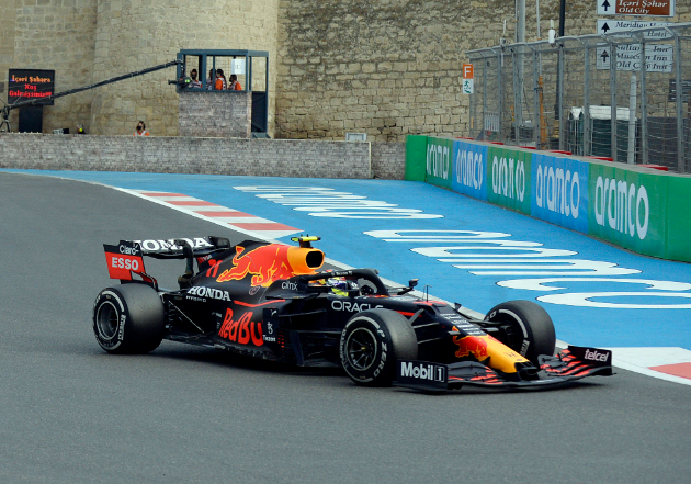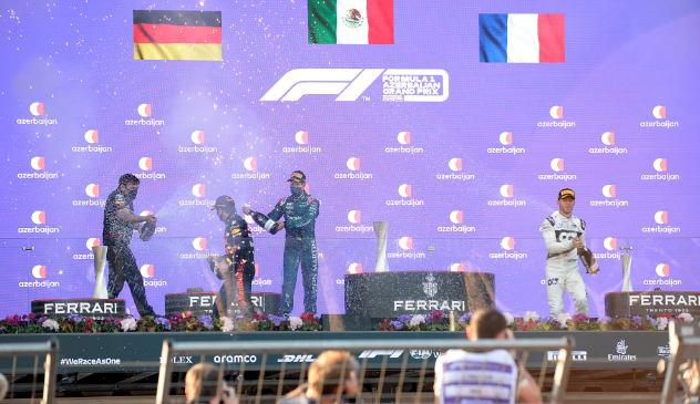 6月6日,紅牛車隊(duì)墨西哥車手佩雷茲在比賽中。 6月6日,佩雷茲(左二)、維特爾(右二)和加斯利(右一)在頒獎儀式上互噴香檳慶祝。