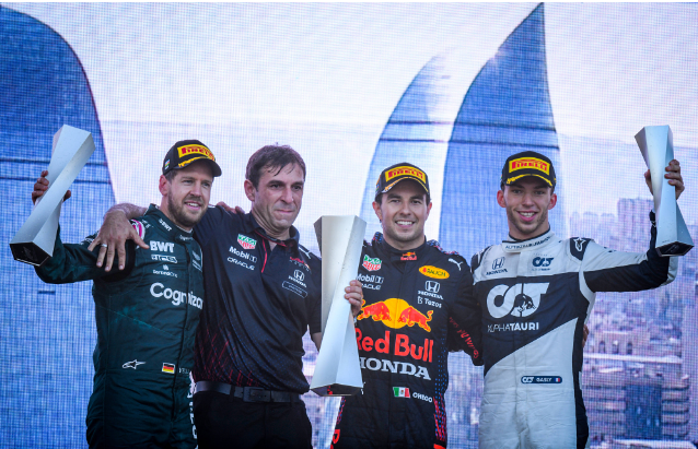 6月6日,冠軍佩雷茲(右二)、亞軍維特爾(左二)和季軍加斯利(右一)在頒獎儀式上合影留念。
